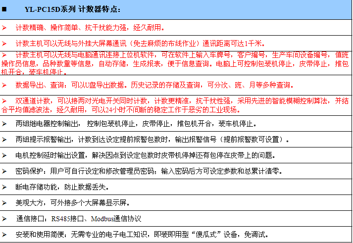 广州宇林YL-PC15D-CE智能计数器是中国包装袋装计数器知名品牌,专用于水泥厂的一款智能型计数器,能够在水泥厂多粉尘的环境下24小时不间断稳定工作。系统通过做多种处理方法效吸收了冗余的干扰信号,智能识别连包和小叠包,达到物品在传送带上精准计数。宇林YL-PC15D-CE智能计数器可帮助企业实现:包装车间成品数量的有效控制与管理,防止多给或少给,减少基层管理人员与客户之间的摩擦,便于销售管理及客户维护。外接大屏幕显示器,公开展示准确的装包数量,使得客户及司机既省心又放心,从而树立良好企业形象